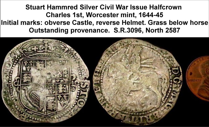 Hammered Silver WORCESTER Civil War Halfcrown. Clear initial marks of a slender Castle (obv) and a Helmet (rev).