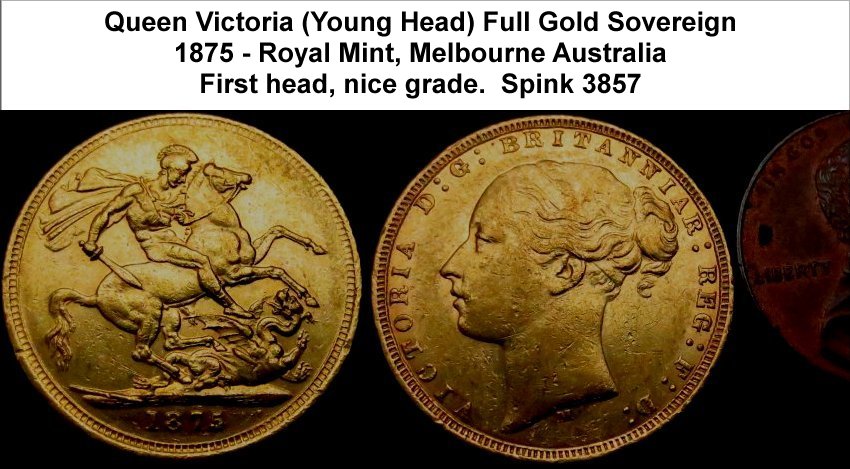WAu-6006: 1875 Queen Victoria Australian (Melbourne) Gold Sovereign. Young head, very nice grade. £325