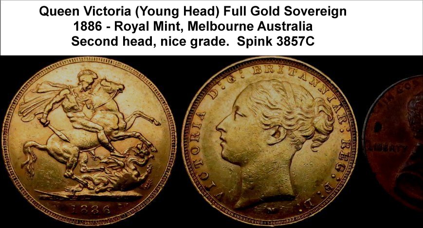 WAu-6007: 1886 Queen Victoria Australian (Melbourne) Gold Sovereign. Young head, very nice grade. £325