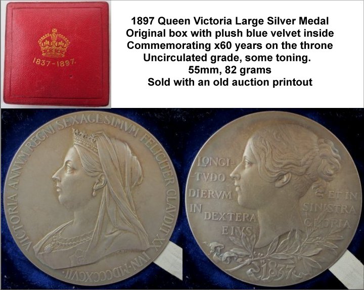 WV-5708: 1897 Queen Victoria Large Silver Medal in Presentation Box. Commemorating x60 years’ reign (1837 – 1897). 55mm diameter, 82 grams of silver. Uncirculated grade. £185