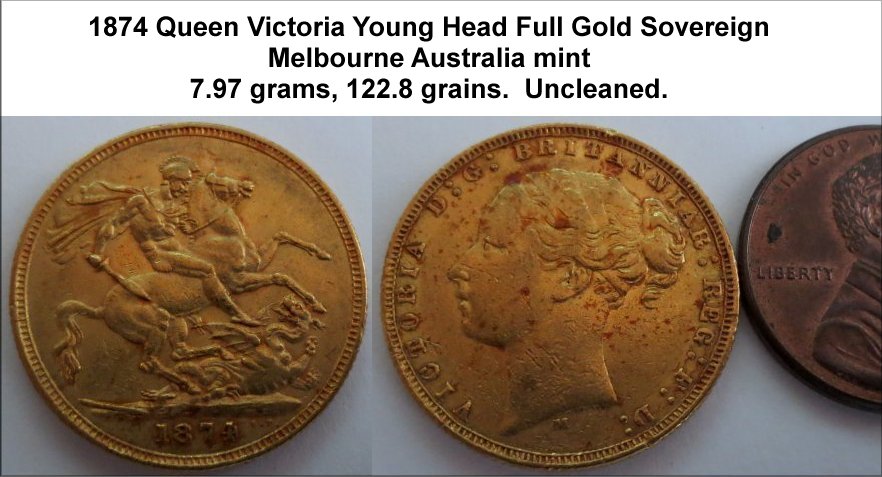WAu-5927: 1874 Queen Victoria Australian (Melbourne) Gold Sovereign. Young head, uncleaned. £295
