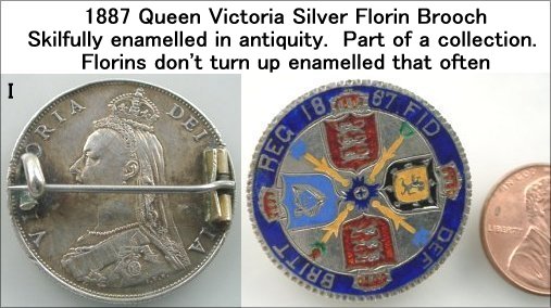 WV-4768: 1887 Queen Victoria Silver Florin – Enamelled Brooch. Beautifully done at the time with no damage to the enamel. Rarer denomination for this kind of artwork. Certainly a striking piece. £69