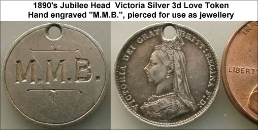 WV-4986: 1890’s Queen Victoria Silver 3d – Love Token. Hand engraved “M.M.B.” and pierced for use as jewellery. See “Love Tokens” in the Medals & Tokens section