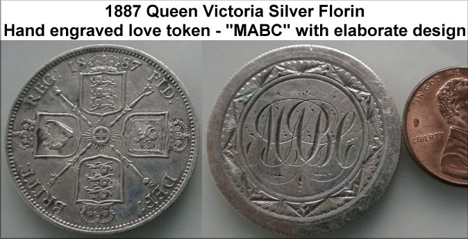 WV-5235: 1887 Queen Victoria Silver Florin – Love Token. Nice grade reverse; obverse removed and hand engraved “MABC”. See Medals & Tokens – “Love Tokens” section