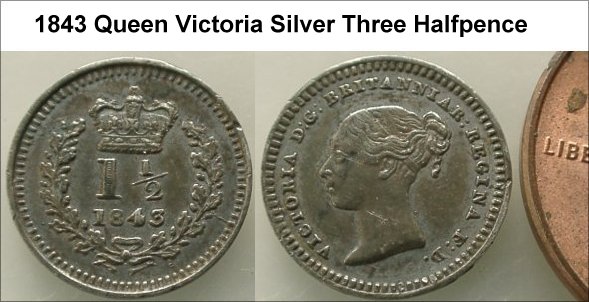 WV-5144: 1843 Queen Victoria Silver Three Halfpence. Nice grade. £29