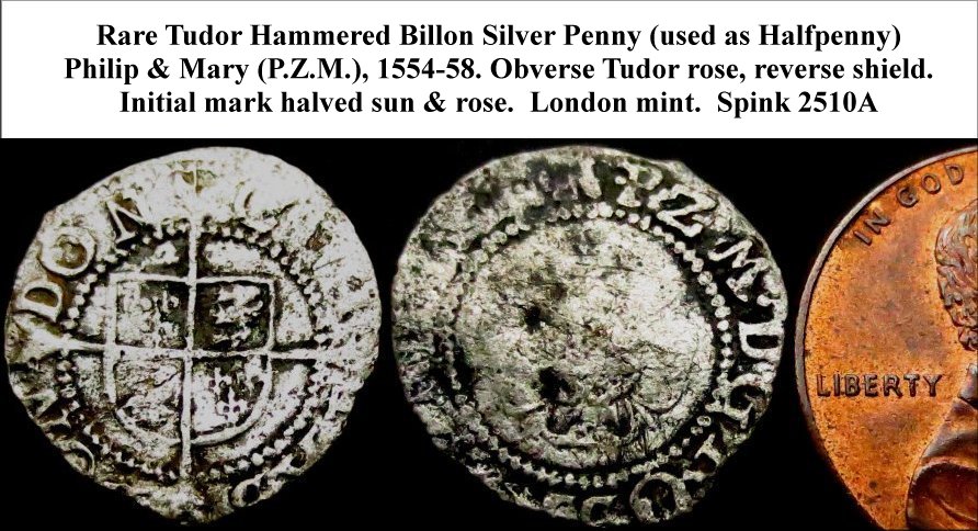 indicating this coin is 1554-58, after Mary married Philip of Spain. Mary was the only child of Henry VIII (her